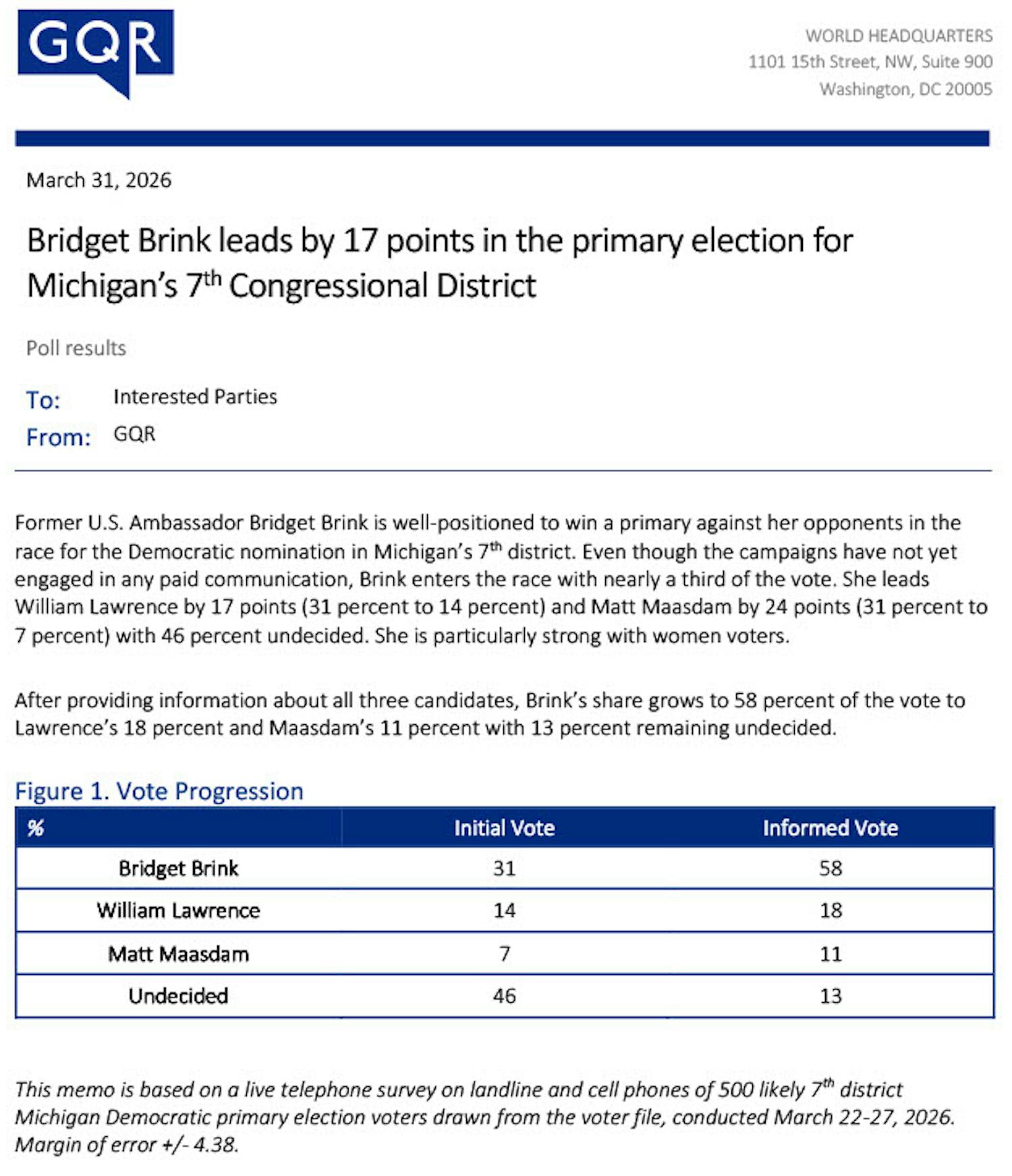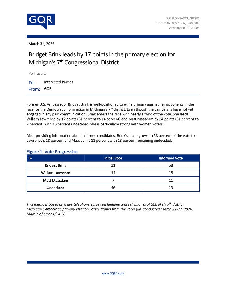 When voters are provided with positive background on all three candidates, Brink’s lead expands even more. Brink’s vote share grows to 58 percent, while Lawrence and Maasdam lag far behind, with 18 percent and 11 percent, respectively. A polling memo from GQR is attached.
